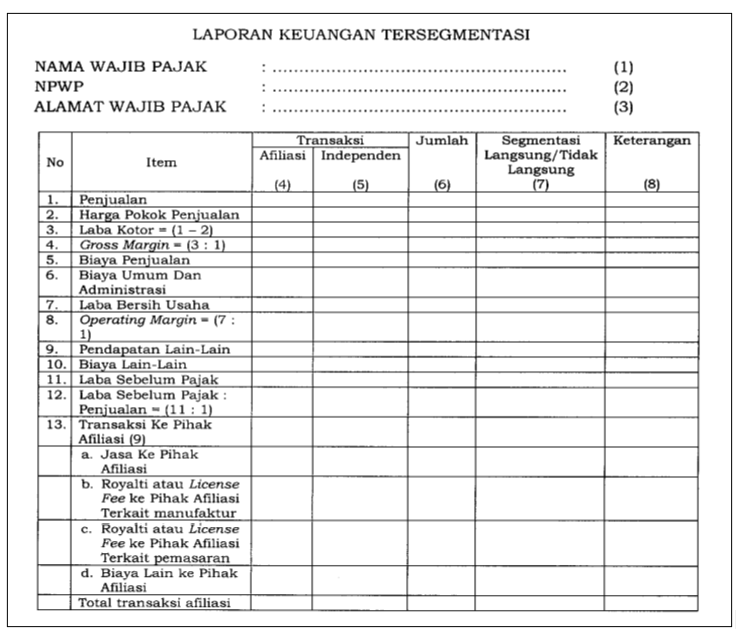 Laporan keuangan tersegmentasi adalah bagian dari dokumentasi yang menyajikan informasi keuangan Wajib Pajak secara terpisah berdasarkan karakterisasi usaha yang berbeda.